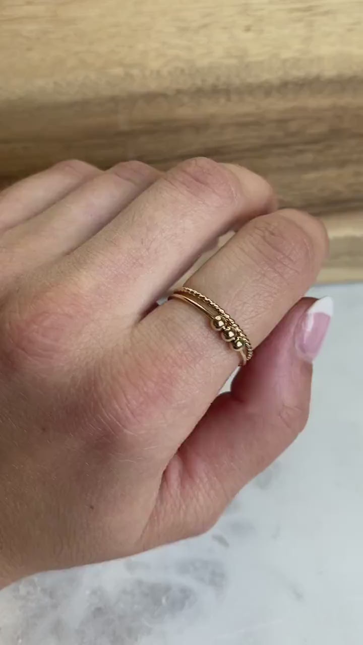This fidget ring set includes one anxiety ring and one stackable twist ring. The anxiety bead ring is dainty yet strong and is a great way to manage stress or anxiety in a stylish way :) The beads move freely around the band of the anxiety ring. You can move the beads on the anxiety ring around to help you stay focused or relaxed. The rope ring makes the perfect stacking ring set and pairs perfectly with the anxiety bead ring - it's a great addition to your to your jewelry collection! Looks really great alone as well as stacked with other rings. Choose from 14K Gold Fill, 14K Rose Gold Fill or Sterling Silver. If you're looking for a combination of metals just send me a message!