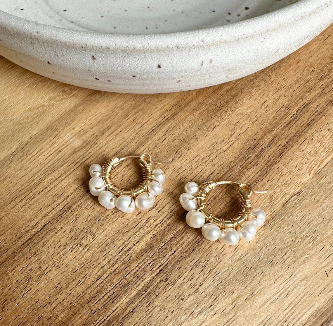 These gold huggie hoop earrings are dainty and lightweight, wrapped with 6-7 freshwater pearls. Simple and elegant, these gold hoop earrings work for special occasions and everyday wear. The hoops are 13mm. The hinged post easily clicks into the catch to create simple, easy-to-use closure.