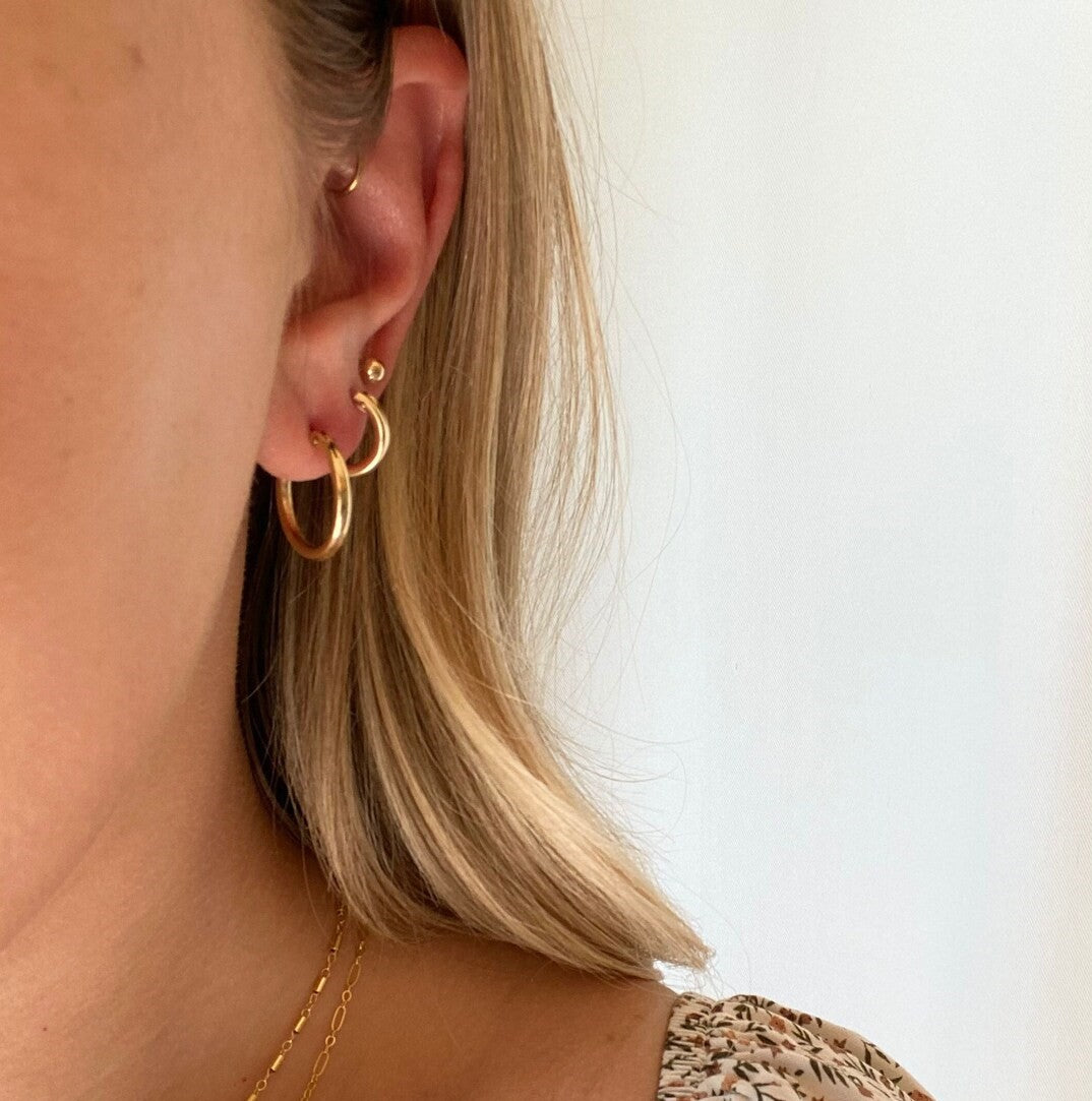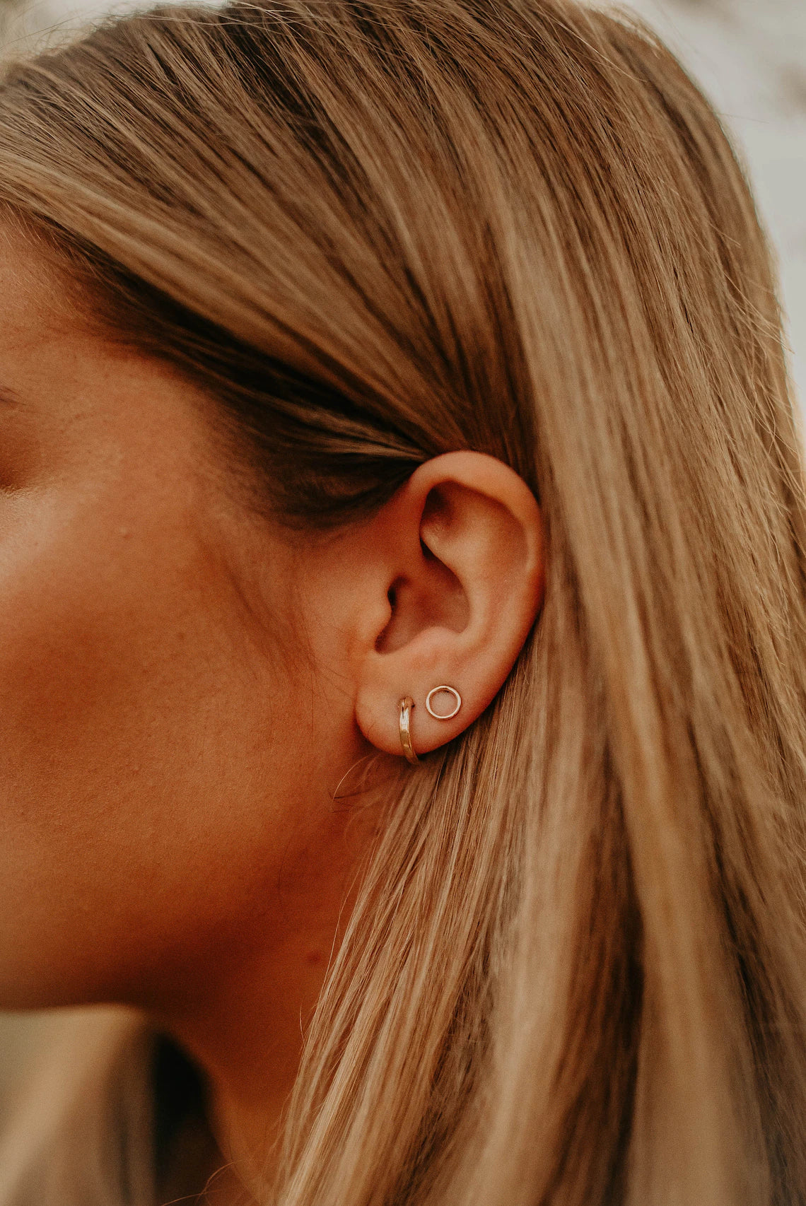 These gold huggie hoop earrings are dainty and lightweight with a minimalist design. Simple and elegant, these gold hoop earrings work for special occasions and everyday wear. These 13mm or 19mm diameter minimalist earrings are handcrafted from 2mm tubing. The hinged post easily clicks into the catch to create simple, easy-to-use closure.
