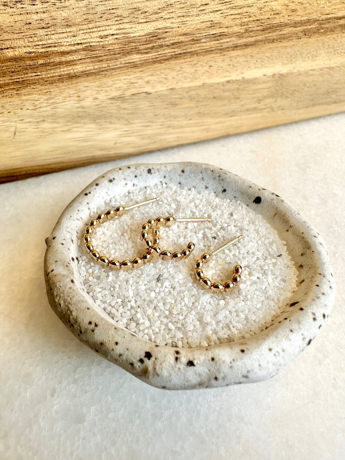 Add a little bit of fun to your ear stack!! These hoop earrings are made with bead wire that is hammered flat to form a beautiful texture. They are available in three different sizes: Tiny - 10mm, Small - 13mm and Medium - 17mm. These hoops are dainty and lightweight with a minimalist design. Simple and elegant, these earrings work for special occasions and everyday wear.